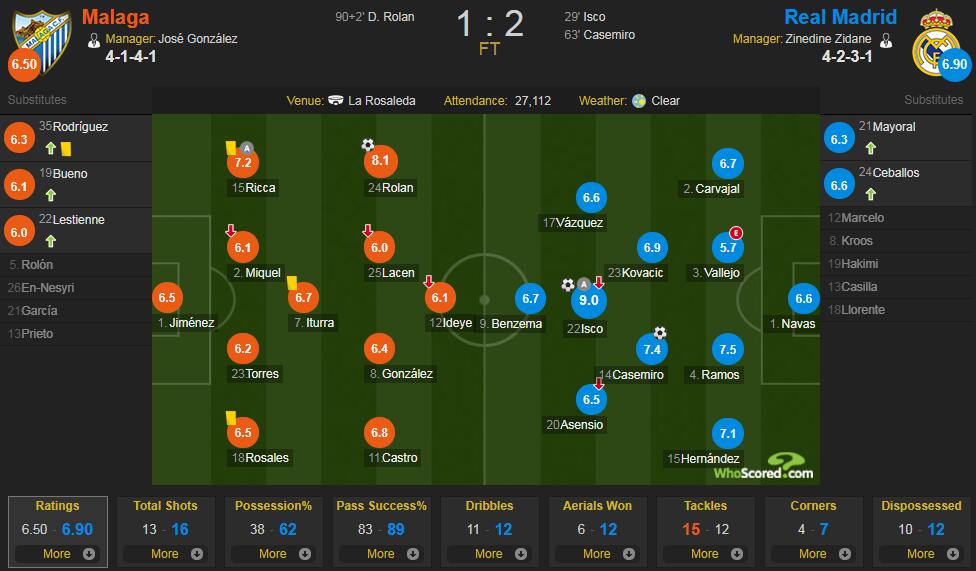 直播吧4月16日讯 北京时间4月16日凌晨2:45分,17-18赛季西甲联赛第32轮,皇马做客挑战马拉加。最终皇马客场2-1力克马拉加拿到3分,伊斯科则是打入一记任意球拿到了全场最高的9.0分。