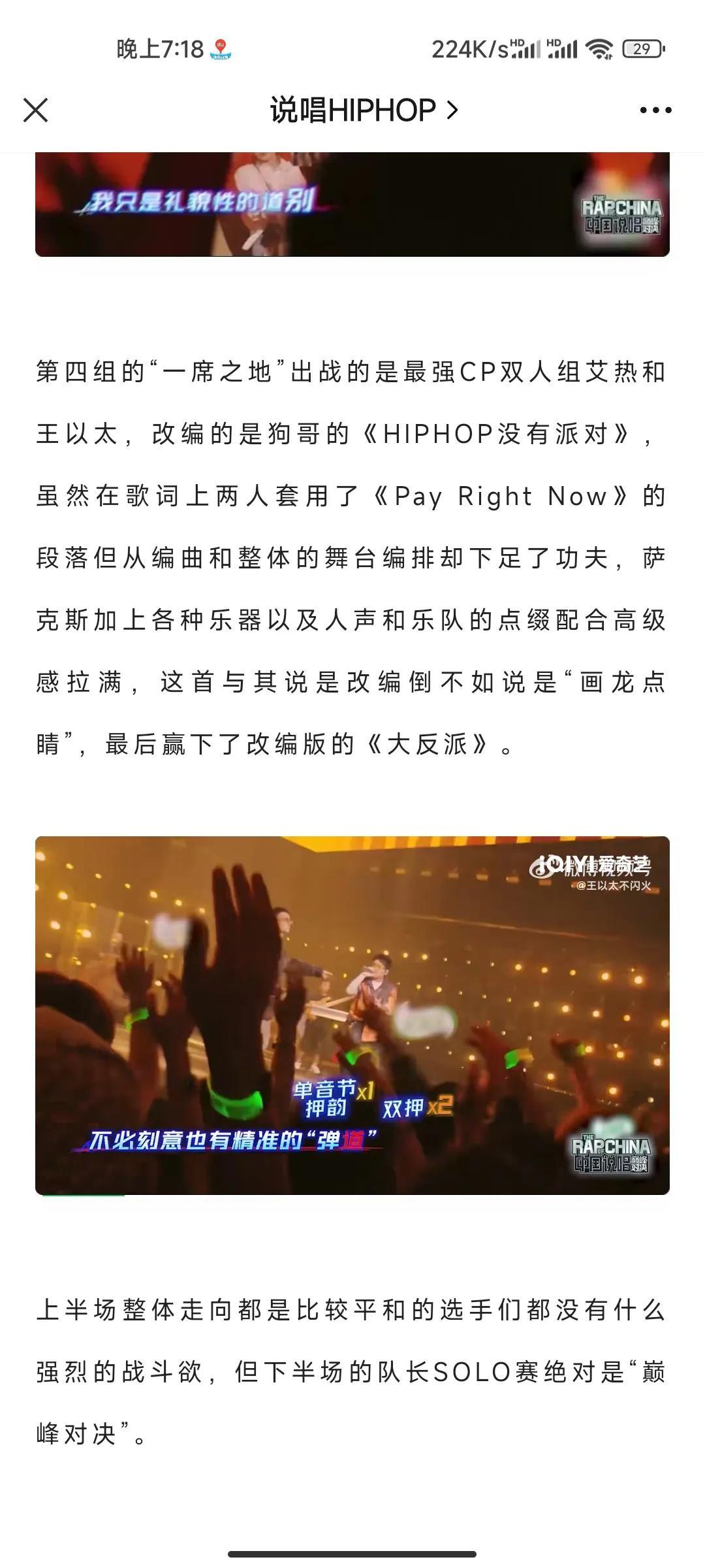 第四组的“一席之地”出战的是最强CP双人组艾热和王以太,改编的是狗哥的《HIPHOP没有派对》,虽然在歌词上两人套用了《Pay Right Now》的段落但从编曲和整体的舞台编排却下足了功夫,萨克斯加上各种乐器以及人声和乐队的点缀配合高级感拉满,这首与其说是改编倒不如说是“画龙点睛”,最后赢下了改编版的《大反派》。