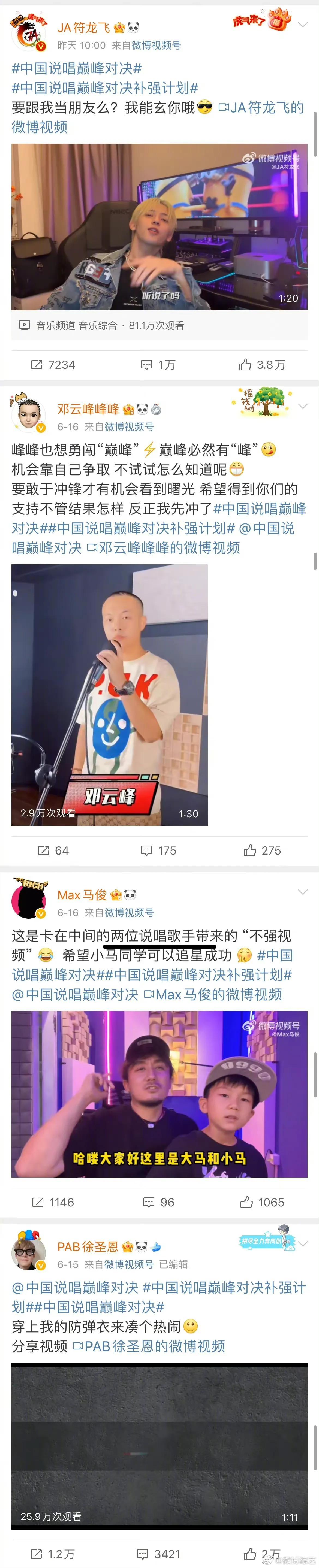 #中国说唱巅峰对决补强人好多#说唱巅峰对决,剧透,勿点,第一轮1v1不涉及淘汰,第二轮二对二对抗。第一轮结果:vava vs 万妮达( vava胜 ),Gai vs 杨和苏(gai胜,杨和苏唱的小丑女,炸歌应该留着丢别人,可惜俩都挺喜欢),Tizzy vs Ice(TT胜),布瑞吉vs 张颜齐(布瑞吉),宝石vs乃万(宝石),李佳隆vs Gali(李佳隆),Capper Vs 早安(capper),黄旭 vs 小白(黄旭),王以太 vs 刘聪(王以太胜),热狗Vs 艾热(热狗胜),盛宇vs PSY.p(大傻胜),派克特vs功夫胖(派克特胜)