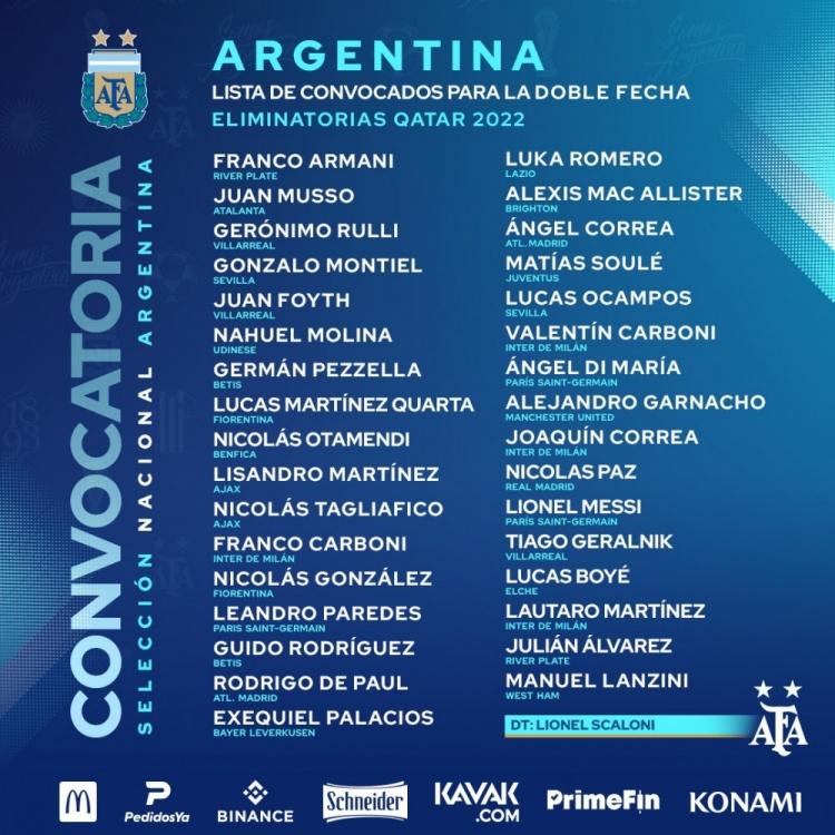 梅西入选名单并担任队长,阿尔瓦雷斯、劳塔罗、恩佐在列,加纳乔、迪巴拉、德保罗等人悉数入选,迪马利亚因伤落选。