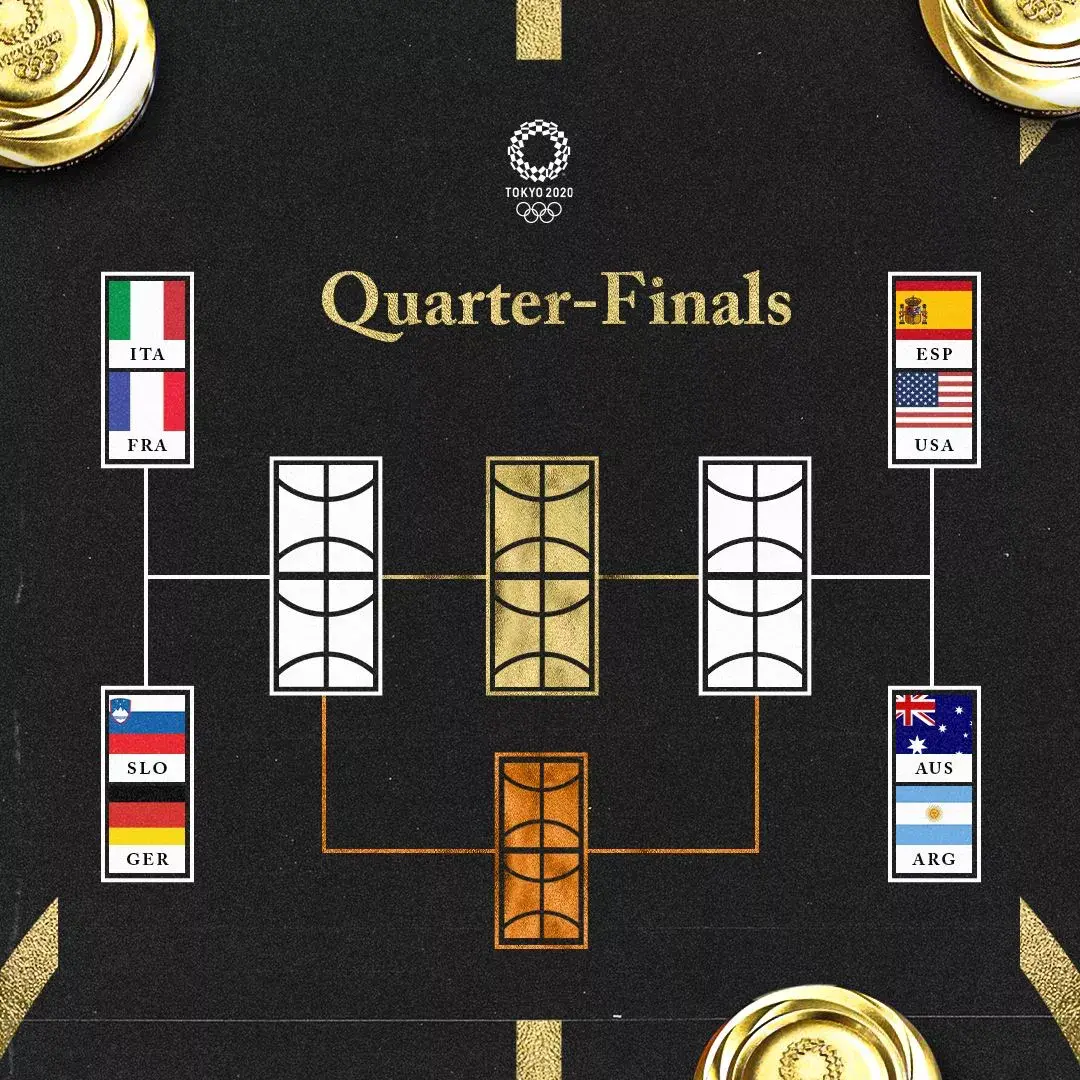 因为小组赛中出现了一些意料之外的比赛结果,再加上淘汰赛抽签的规则,导致今年的四分之一淘汰赛,可能是奥运会历史上,四组对手彼此实力最接近的一次了。美国对决西班牙,是如今世界排名第一和第二的对决;澳大利亚碰阿根廷,则是世界第三对阵世界第四。另外一个半区的法国与意大利,两队的国际篮联排名是世界第七和第十;而世界排名第16的斯洛文尼亚,将面对排名第17的德国。