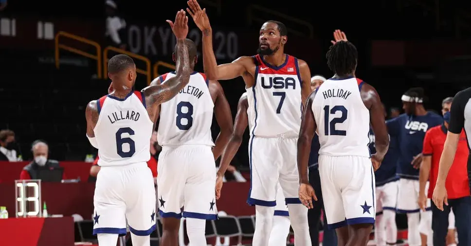 美国男篮:杜兰特9中8得到23分2板,詹姆斯21分7板9助,库里11分3板3助,朱-霍勒迪15分4板3助2断;