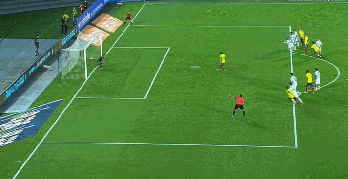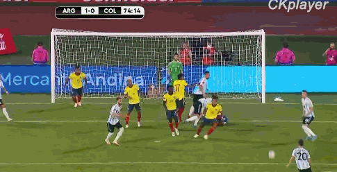 比赛第33分钟,迪玛利亚任意球直接攻门,哥伦比亚门将奋力扑出