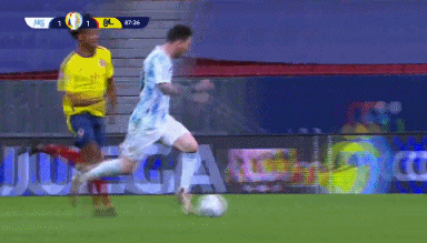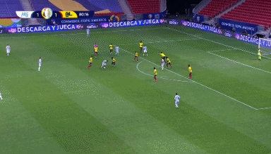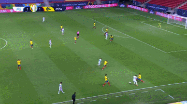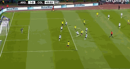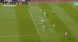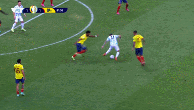第83分钟,前场右路佩雷斯带球突破被断球,梅西前场反抢断球,禁区右侧直接带球内切,突破到了禁区内,甩开防守球员,横敲中路,远端迪玛利亚跟进破门,阿根廷3-0哥伦比亚!