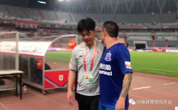 谢场的最后,王永珀跑步走过来,在球场中圈附近,跟鲁能主帅李霄鹏拥抱致意,两个人简单交流了一分钟,而且窃窃私语了几句话。