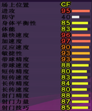 【游戏里重要数据】:进攻95,平衡85,体能83,最快速度96,加速度97,敏捷93,带球精度93,带球速度88,射门精度88,力量87,球感90,进攻欲望96。年龄22,成长系统下依然有很大提高空间。