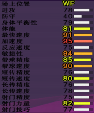 【游戏里重要数据】:进攻78,体能81,最快速度91,加速度95,敏捷94,带球速度90,带球精度85,年龄18,成长系统下大有作为。