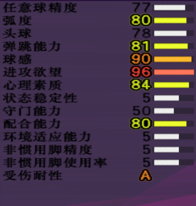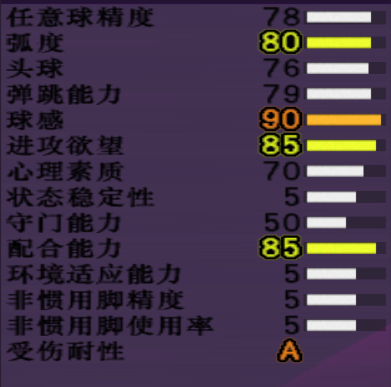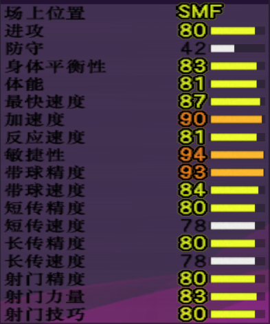 【游戏里重要数据】:进攻80,平衡83,体能81,最快速度87,加速度90,敏捷94,带球精度93,长传精度80,射门精度80,力量83,球感90。年龄19,成长系统下大步前进。