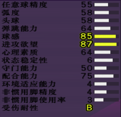 【游戏里重要数据】:防守85,平衡89,体能83,最快速度82,弹跳87,头球86,年龄21,大师联赛成长值很快,冉冉新星。