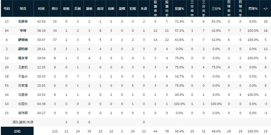 四川丰谷酒业爱德蒙-萨姆纳37分5板5助3断1帽,马库斯-亨特33分2板7助3断,左朕年15分1助1断;
