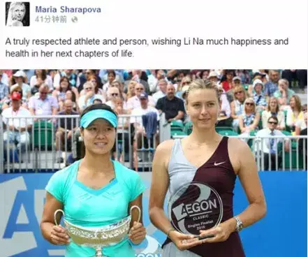 当李娜宣布正式退役的时候,网坛多位名将纷纷推特发表对李娜的祝福和怀念。而莎拉波娃的推特令人瞩目!因为她发的照片是李娜捧着冠军奖杯和端着亚军奖杯的莎拉波娃合影的,这是李娜曾经2010在伯明翰7-5,6-1战胜莎拉波娃夺冠的呢!莎拉波娃的意图很明显!李娜在她心里就是冠军,因为李娜曾经一度四连胜莎拉波娃,另外莎拉波娃看到了李娜的努力和汗水,还看到李娜在中国以及亚洲的深远影响力。