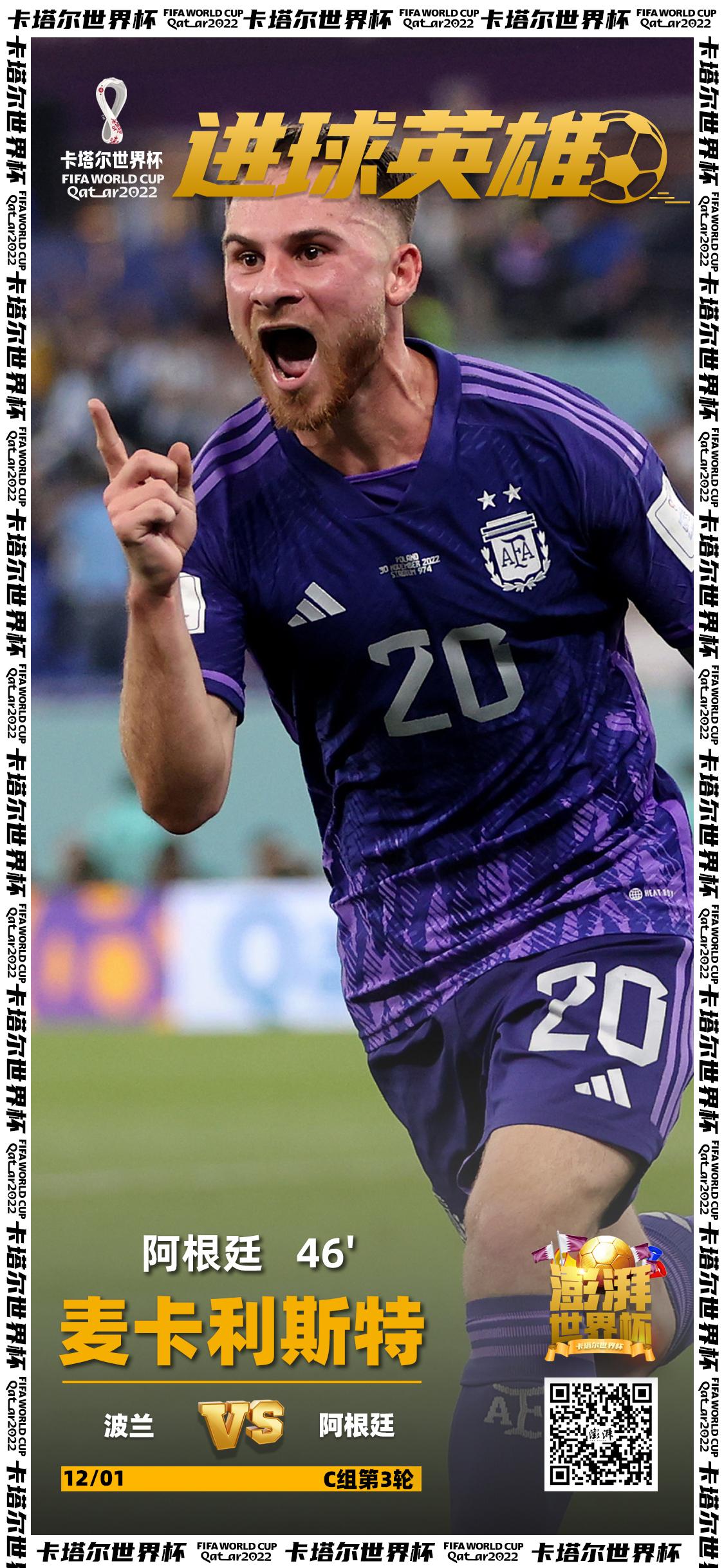 第46分钟,阿根廷队边路传球,迪马利亚、莫利纳连续传导,莫利纳底线传中,麦卡利斯特跟上推射,什琴斯尼鞭长莫及,球从后角滚进球门。阿根廷队闪电破门,1-0领先波兰。