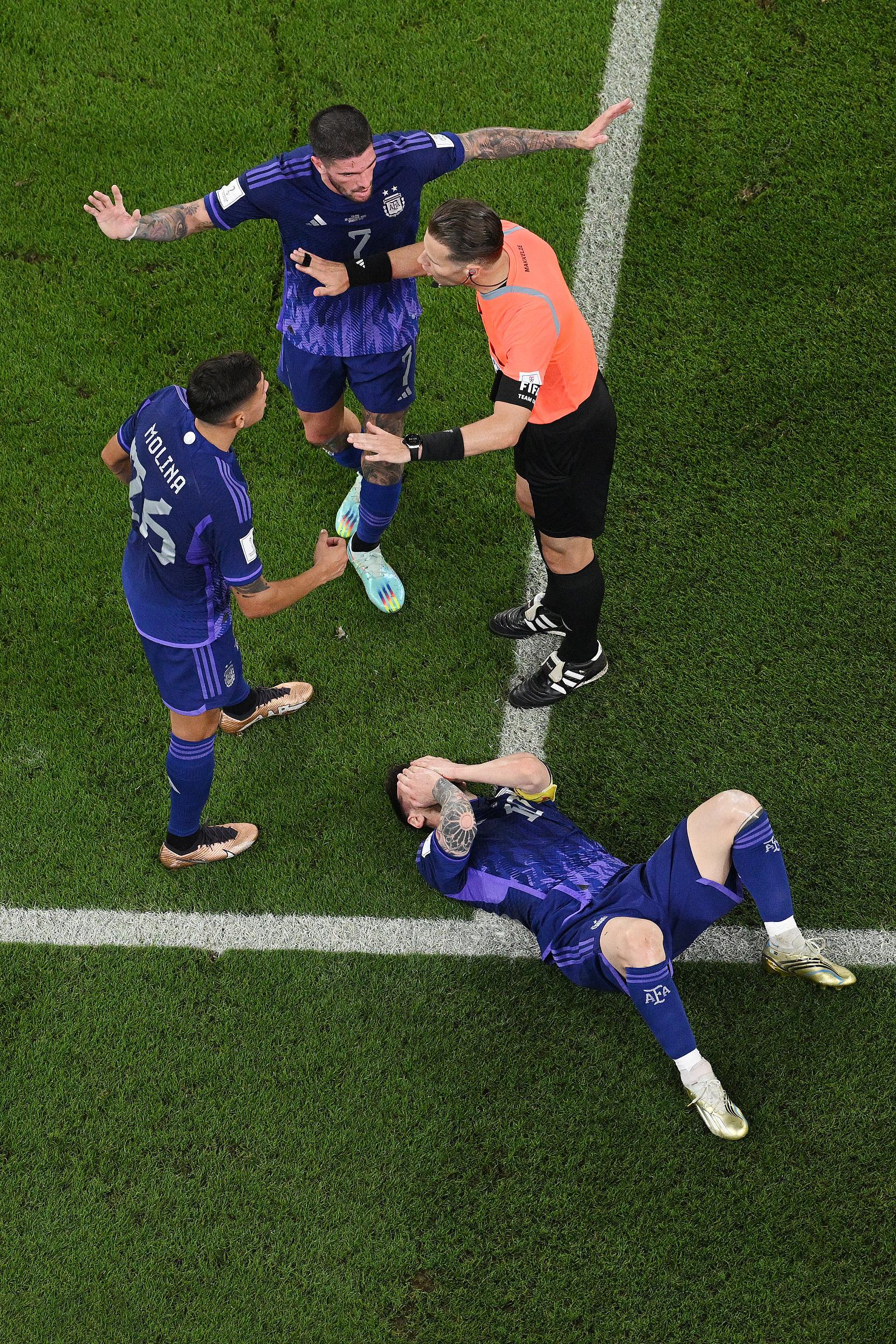 第39分钟,阿尔瓦雷斯禁区左侧射门被什琴斯尼扑出后传中,什琴斯尼后点托出后手触梅西面部,并将梅西撞倒在地,阿根廷队员提出申诉,荷兰主裁马克利到场边观看VAR回放后补吹点球,但梅西主罚的点球被什琴斯尼托出,阿根廷错失进球良机。