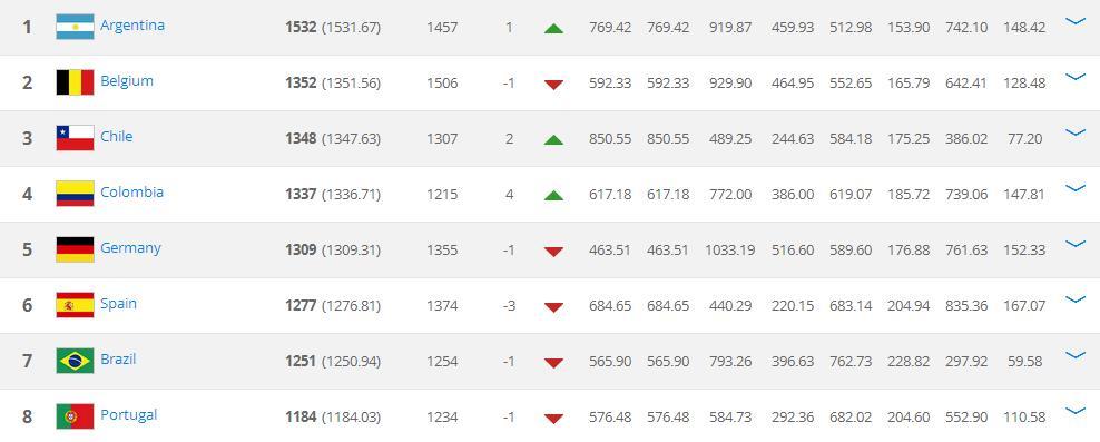 凭借着在俄罗斯世界杯南美区预选赛上的表现,阿根廷挤掉了此前5个月排名榜首的比利时,排名第一。智利队排名上升两位,排在阿根廷和比利时之后位列第三,创下了队史新高。哥伦比亚上升四位排名第四,乌拉圭上升两位排名第九,奥地利则下降一位,被挤出了前十,位列第11位。