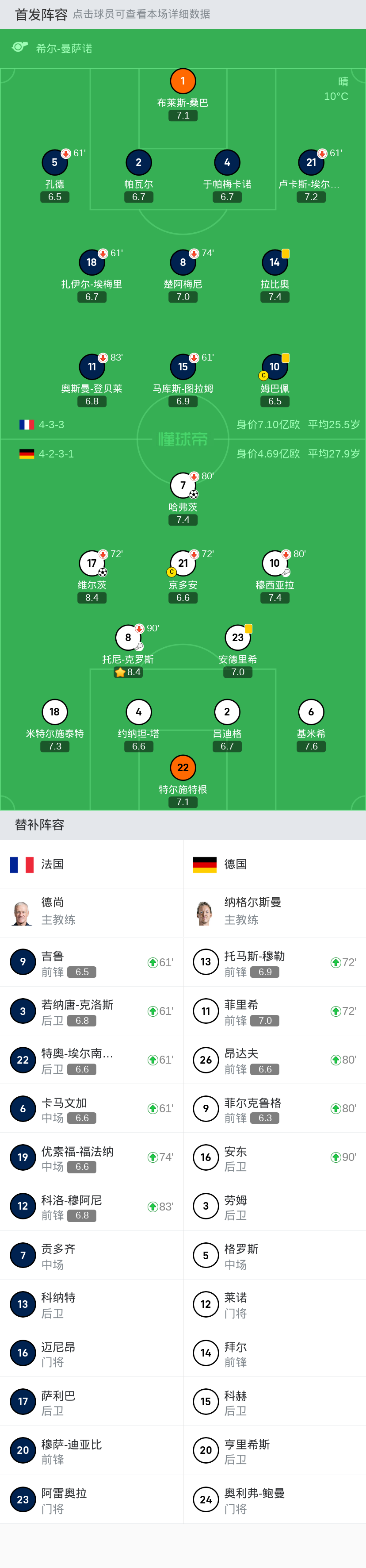 替换下场:61'21-卢卡斯-埃尔南德斯, 83'11-奥斯曼-登贝莱, 61'15-马库斯-图拉姆, 61'5-孔德, 74'8-楚阿梅尼, 61'18-扎伊尔-埃梅里