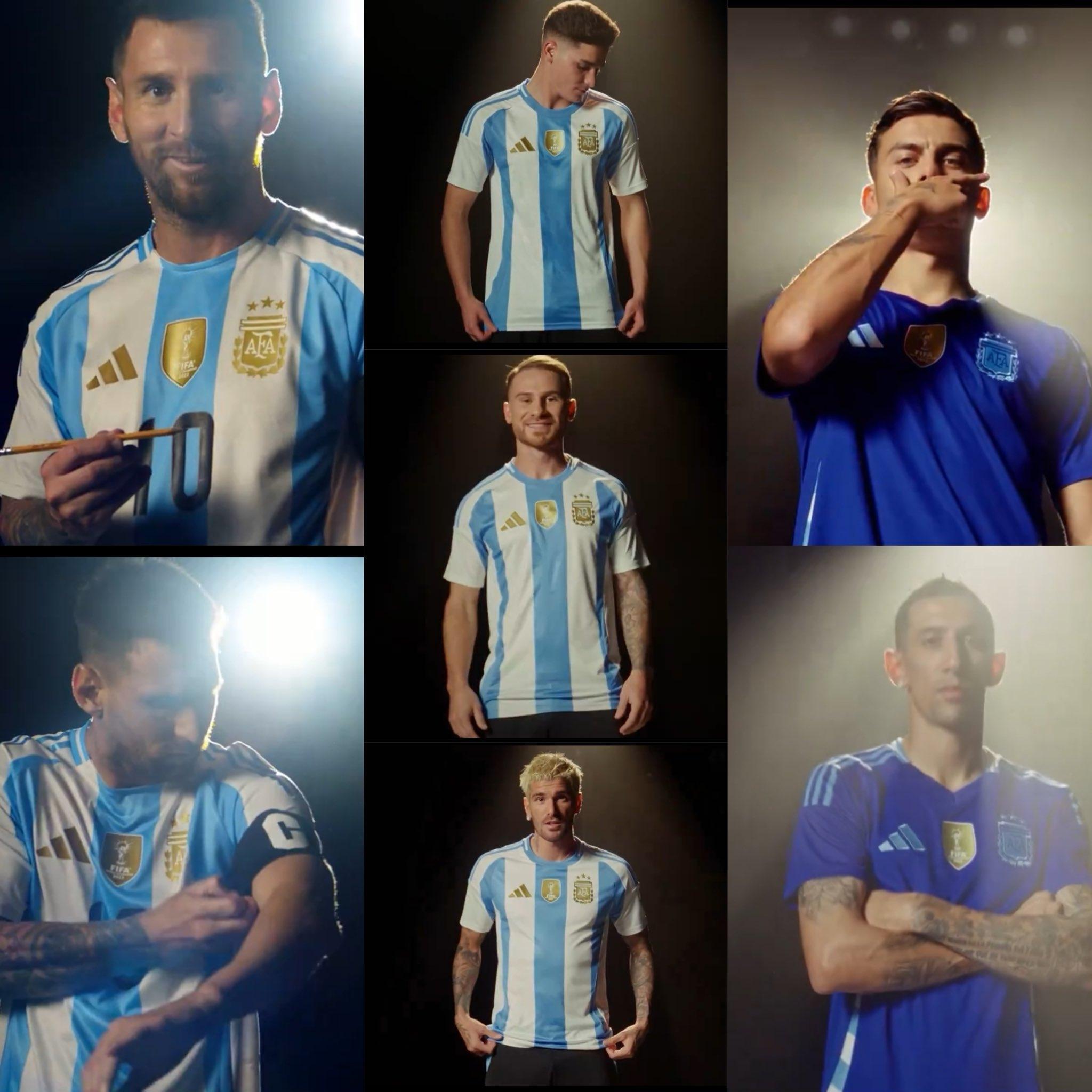 阿根廷将身披这套球衣征战美洲杯,球衣上logo均为金色,阿迪达斯标志和阿根廷队徽中间是2022年世界杯冠军标识,阿根廷队徽上也变成了三颗星。