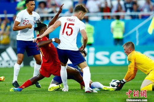俄罗斯世界杯G组,比利时1:0战胜英格兰。图为双方争抢足球。中新社记者 富田 摄