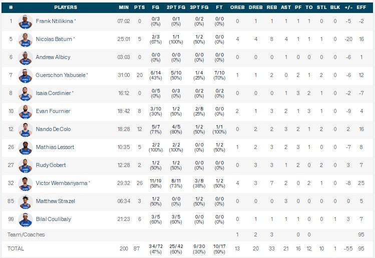 法国男篮文班亚马26分7板2助1断,亚布塞莱20分2板2断,德科洛12分2板3助2断;