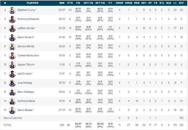 美国男篮斯蒂芬-库里24分1板5助1断,杜兰特15分4板4助1断1帽,德文-布克15分6板3助,詹姆斯14分6板10助。
