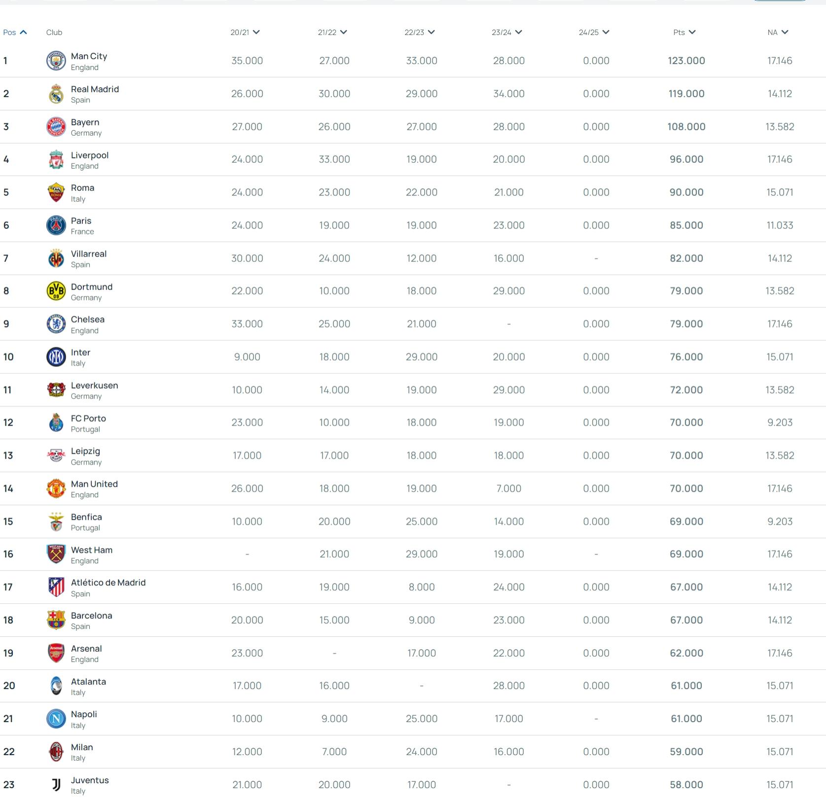 直播吧07月12日讯 今日欧足联更新了俱乐部系数排名,去除了2019/20赛季的各队积分,加入了尚未开始的2024/25赛季,重新计算近五个赛季各俱乐部在欧战中的积分。在此次更新中,曼城继续排名第一,皇马超越拜仁排名第二。