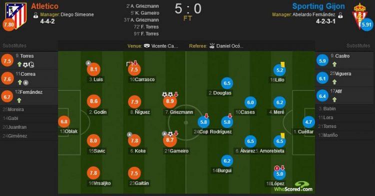 本场比赛梅开二度制造多次进球机会的格列兹曼荣获全场最佳,加梅罗和戈丁同样表现出色;希洪竞技方面,开场就出现致命失误的洛佩兹和门将奎利亚尔等多人不及格。