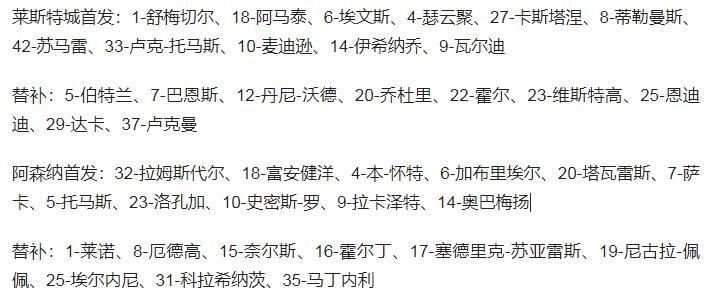 莱斯特城首发:1-卡斯帕-舒梅切尔、27-卡斯塔涅、6-埃文斯(69’18-阿马泰)、4-瑟云聚、33-卢克-托马斯(46’11-奥尔布莱顿)、21-里卡多-佩雷拉、25-恩迪迪、8-蒂莱曼斯、15-哈维-巴恩斯(50’19-云代尔)、14-伊希纳乔、9-瓦尔迪