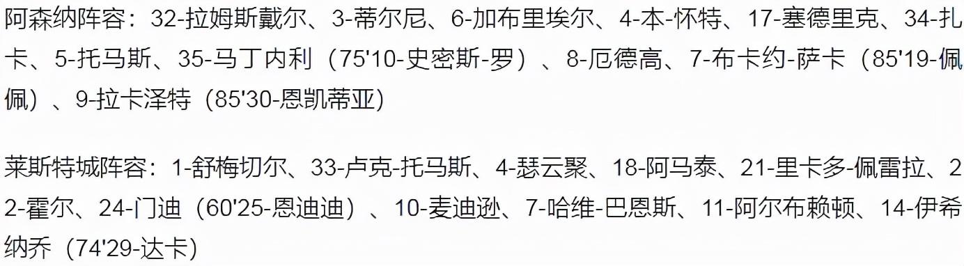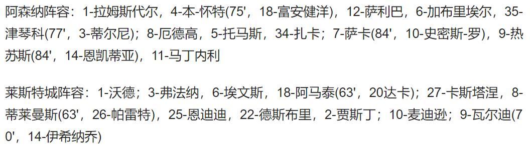 最终,全场比赛结束,阿森纳2-0战胜莱斯特城,各项赛事九场不败。