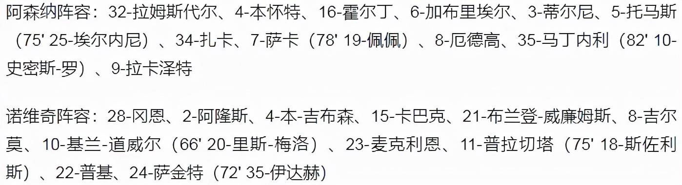 诺维奇(4-3-3):1-克鲁尔;2-阿隆斯、5-汉利、21-布兰登-威廉姆斯、44-奥莫巴米德里;7-卢卡斯-鲁普(80’35-伊达赫)、20-里斯-梅洛、23-麦克莱恩;10-基兰-道威尔(61’14-坎特维尔)、18-斯佐利斯(68’17-拉希察)、22-普基