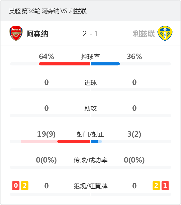 最终,全场比赛结束,阿森纳2-1战胜十人利兹联。