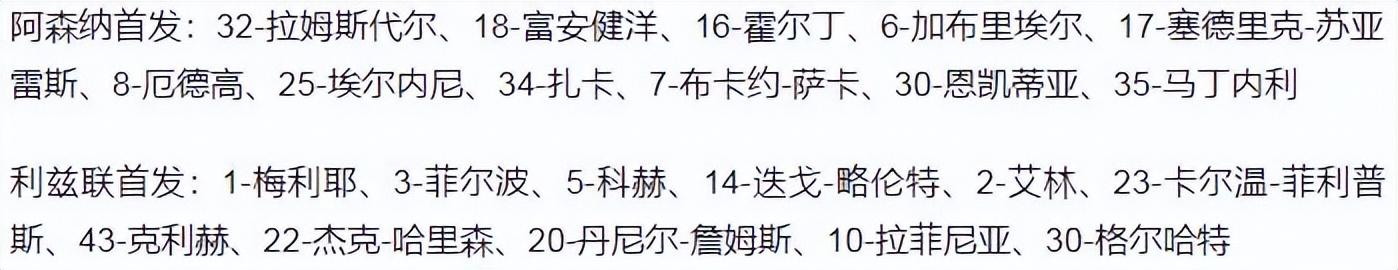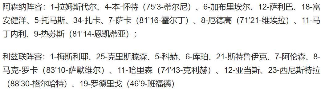 阿森纳首发:32拉姆斯代尔;17塞德里克,16霍尔丁,6加布里埃尔,18富安健洋;34扎卡,25埃尔奈尼;7萨卡(69',19佩佩),8厄德高,35马丁内利(78',10史密斯-罗);30恩凯迪亚(91',9拉卡泽特)