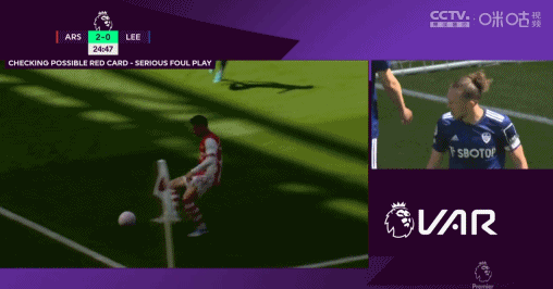 第26分钟,落后的利兹联再遭打击,艾林亮鞋底飞铲马丁内利,主裁先出示了黄牌,但在VAR裁判提醒下改判直接红牌将艾林罚下,利兹联只剩十人。
