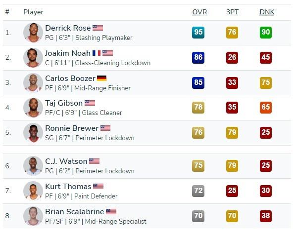 2010-11赛季的公牛就是经典球队之一,这支球队中,罗斯能力值95,诺阿能力值86,布泽尔能力值为85。
