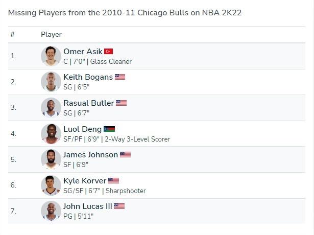 注:球队中以下球员因2K公司无版权等原因未能出现在此名单中: