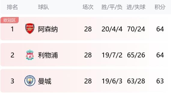 阿森纳目前积64分排名榜首,曼城积63分排名第三。联赛赛程所剩不多,本场比赛的结果将对最终的冠军归属产生极大影响。