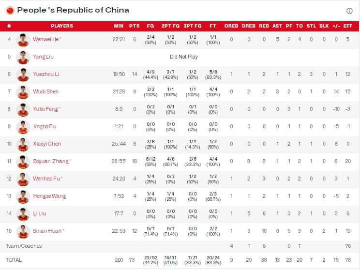 第四节,前半节双方继续拉锯,但节中段法国连续三分将分差拉大至6分,中国男篮迅速调整沈无敌、郇斯楠领衔一波9-0反超3分,随后双方苦战,关键时刻张博源抛射打进,中国男篮领先3分,还剩9秒留给法国,中国男篮完成出色防守,全场结束,中国男篮73-70法国。