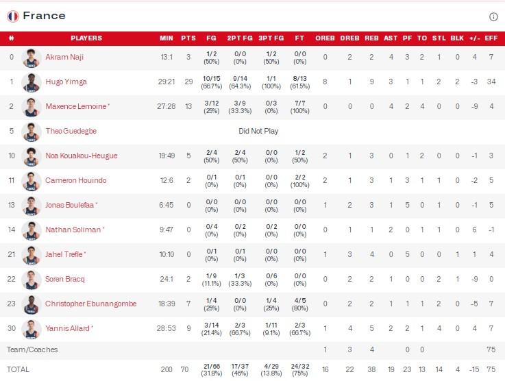 法国男篮文班亚马18分11板2断2帽,斯特拉泽尔15分,富尼耶14分3板6助1断。