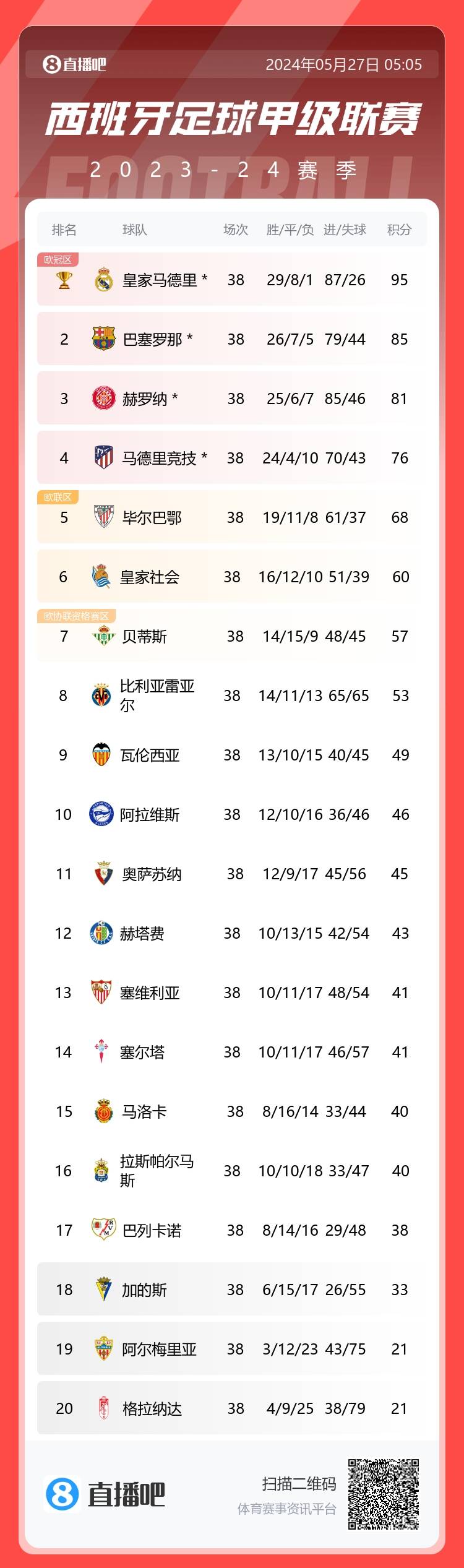 直播吧5月27日讯 23/24赛季西甲联赛收官,皇马夺冠,巴萨第二,赫罗纳第三,马竞第四,多夫比克获得西甲金靴,巴埃纳获得助攻王。