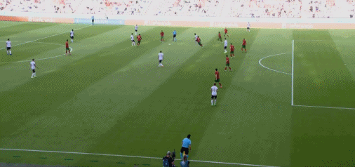 第5分钟,德国队先进一球,右路的金特尔起球到门前,前点的格纳布里抢点被碰到,后点的戈森斯分身侧勾将球打进。在德国队庆祝时,葡萄牙队向裁判投诉穆勒手球在先。主裁观看VAR后认定,格纳布里越位在先,德国队进球无效。