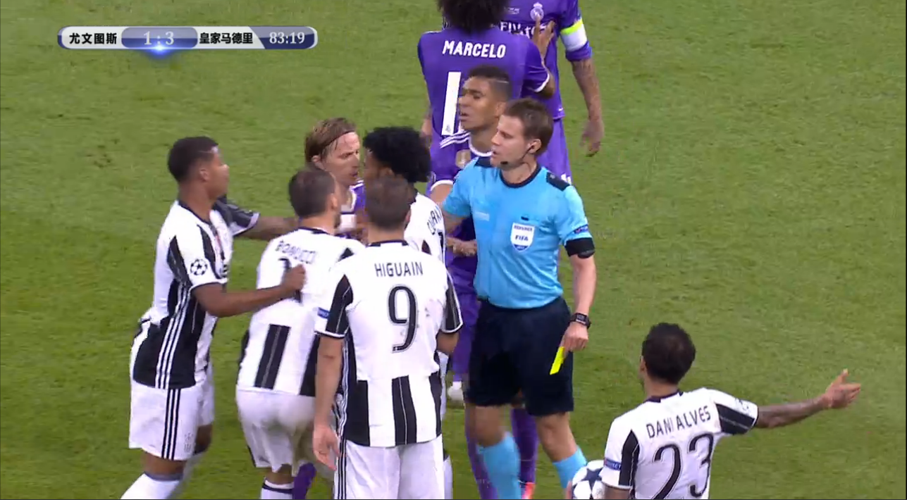 第83分钟,尤文图斯的夸德拉多踩到拉莫斯,两黄变一红被罚下场。他也是第4个在欧冠决赛赛场被罚下的人。比赛只剩下几分钟,尤文图斯仿佛已经无力回天。