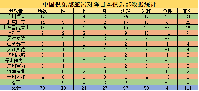 附:中国俱乐部亚冠对阵日本俱乐部数据统计