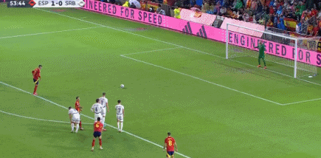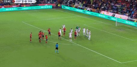 第77分钟,扩大比分!巴埃纳主罚任意球直接破门,西班牙3-0塞尔维亚