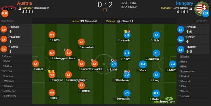 匈牙利中场大将格拉-佐尔坦获得全场最佳。奥地利前场攻击群普遍获得低分,染红离场的德拉戈维奇得分最低。