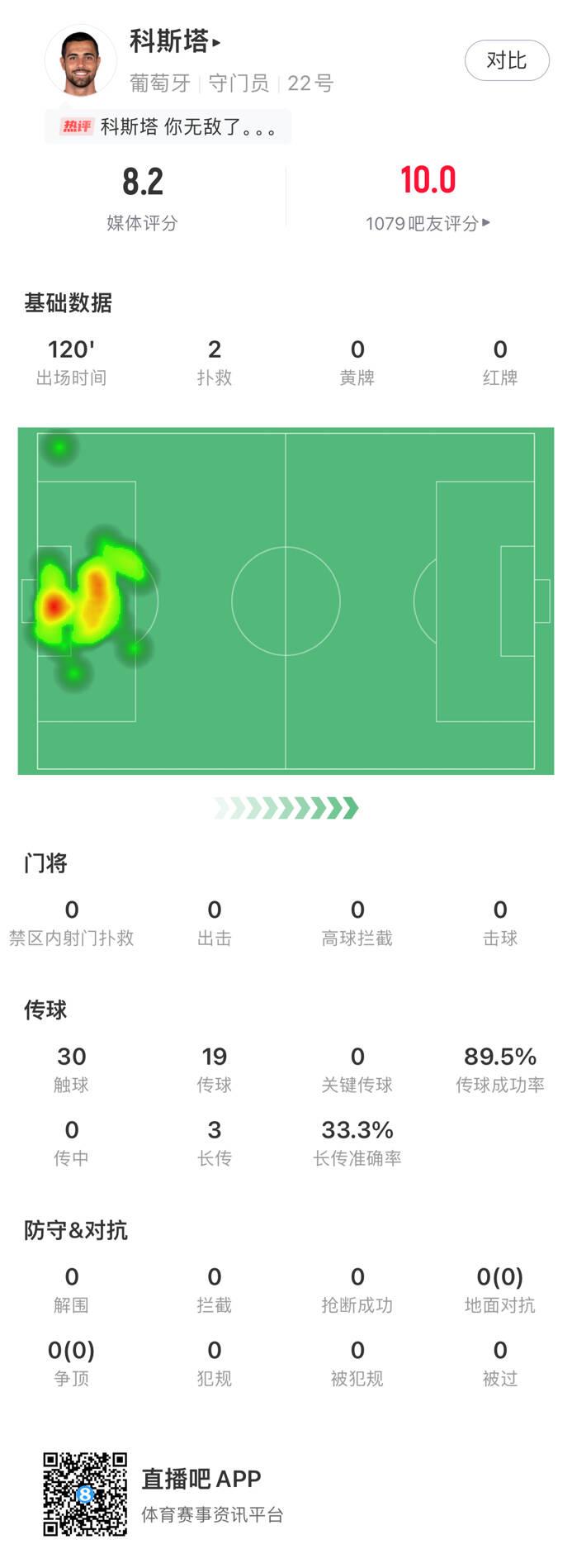 直播吧07月02日讯 欧洲杯1/8决赛,葡萄牙点球大战0-0斯洛文尼亚。科斯塔点球大战3扑点获评全场最佳球员。