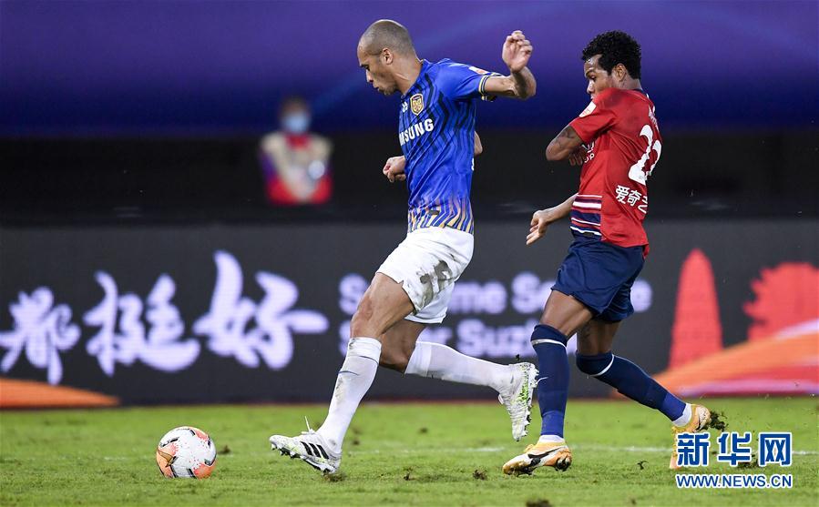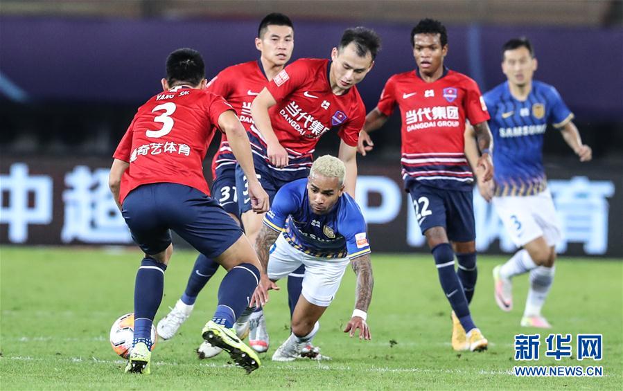 10月19日,重庆当代队球员费尔南迪尼奥(右)在比赛中带球进攻。 当日,在2020赛季中国足球协会超级联赛(苏州赛区)第15轮比赛中,重庆当代队以1比1战平江苏苏宁易购队。 新华社记者 许畅 摄