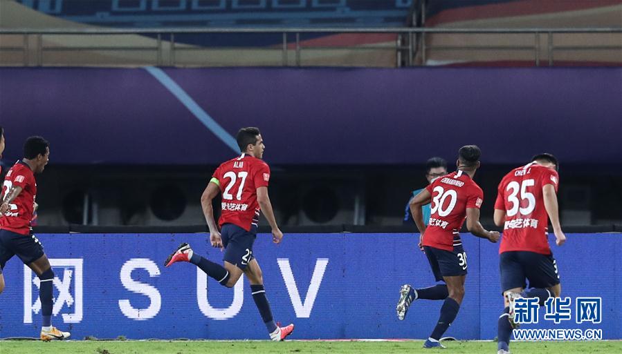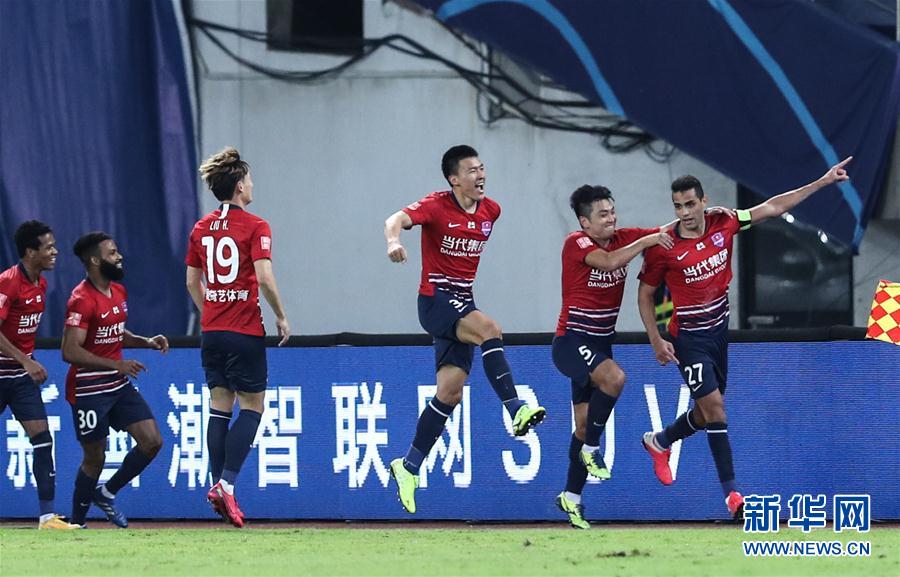 10月19日,重庆当代队球员卡尔德克(左二)在比赛中庆祝进球。 当日,在2020赛季中国足球协会超级联赛(苏州赛区)第15轮比赛中,重庆当代队以1比1战平江苏苏宁易购队。 新华社记者 杨磊 摄