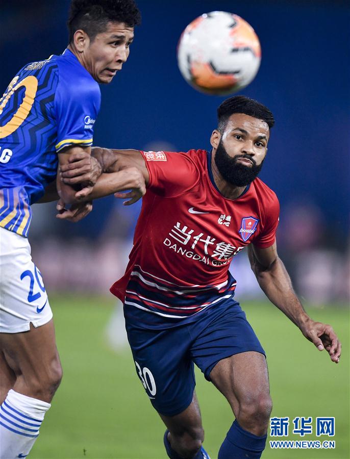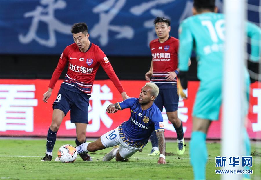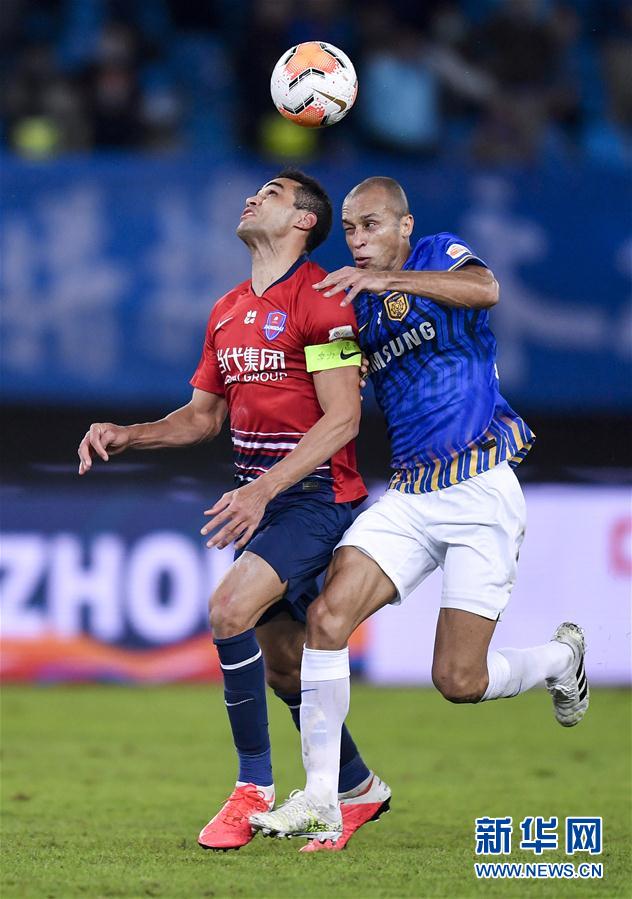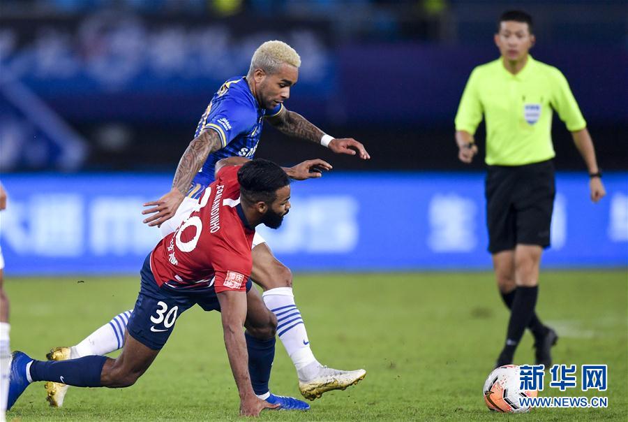 10月19日,重庆当代队球员费尔南迪尼奥(右)在比赛中拼抢。 当日,在2020赛季中国足球协会超级联赛(苏州赛区)第15轮比赛中,重庆当代队以1比1战平江苏苏宁易购队。 新华社记者 许畅 摄