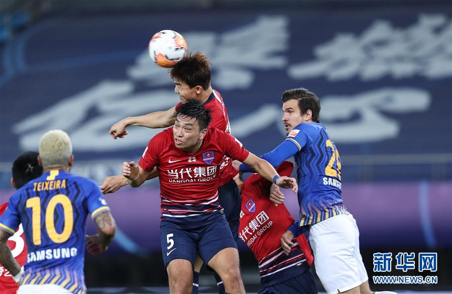 10月19日,重庆当代队球员蒋哲(中下)在比赛中拼抢头球。 当日,在2020赛季中国足球协会超级联赛(苏州赛区)第15轮比赛中,重庆当代队以1比1战平江苏苏宁易购队。 新华社记者 杨磊 摄