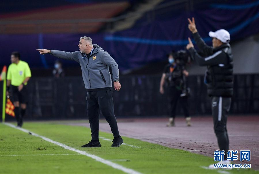 10月19日,江苏苏宁易购队主教练奥拉罗尤(左)在场边指挥。 当日,在2020赛季中国足球协会超级联赛(苏州赛区)第15轮比赛中,重庆当代队以1比1战平江苏苏宁易购队。 新华社记者 许畅 摄