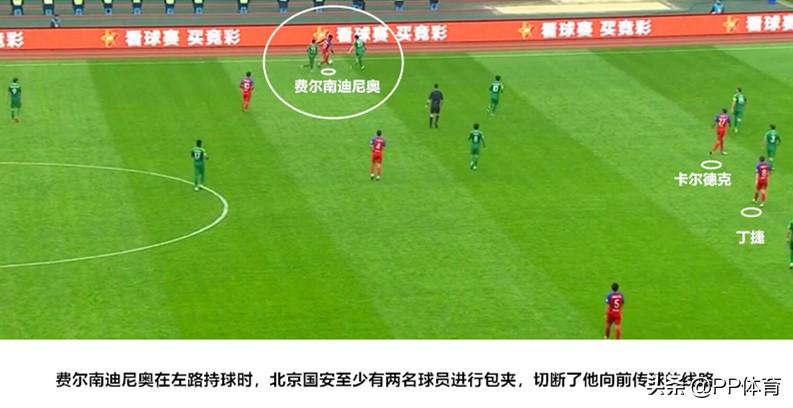 但此役费尔南迪尼奥活动范围受到限制,一旦他在边路拿球时,国安至少有两名球员上前进行包夹,来切断他向前推进的线路。同时,费尔南迪尼奥得到的支援也不够多——中场缺少接应、前锋无人拉边,费尔南迪尼奥逐渐陷入到单干受阻的困局中,速度优势完全没发挥出来。