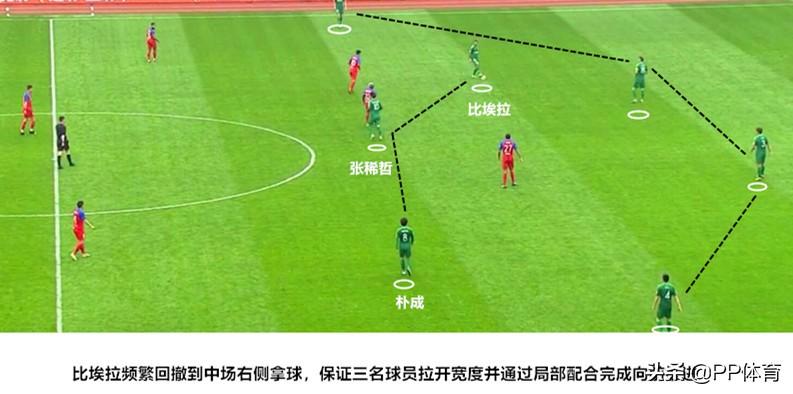 此役国安在中场仍然布置了四名球员。从实际站位来看,张稀哲与朴成搭档双后腰,并轮番回撤到双中卫身前接应。而奥古斯托与比埃拉则分居中场左右两侧,但活动范围非常大,经常内收协助双后腰出球。如上图则是比埃拉回撤拿球,帮助国安的进攻向前推进。